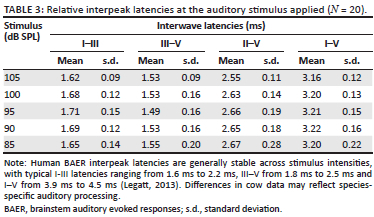 The relative interpeak latencies (I-III, III-V, II-V and I-V) measured in the 10 cows are shown in Table 3, according to the intensity of the auditory stimulus applied (dB SPL) during testing. The interpeak latencies remained similar regardless of the intensity of the stimulus (Table 3).