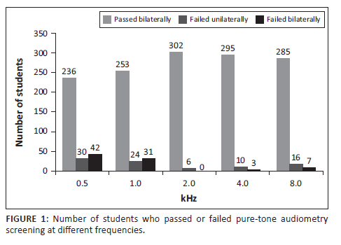 The test results indicated that 73.7% of the students (227 girls and 56 boys) passed the PTA screening (Table 1). The remaining 26.3% (55 girls and 26 boys) failed bilateral PTA screening. More than half of the students who failed the PTA screening failed at 0.5 and/or 1 kHz. Approximately 87.8% of the students who failed the PTA screening (n = 71) failed in either one or both ears at 0.5 kHz, followed by 1 kHz (67%), 8 kHz (39%), 4 kHz (15%) and 2 kHz (7%) (Figure 1).