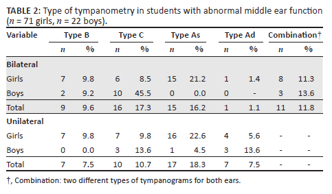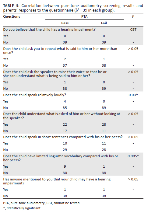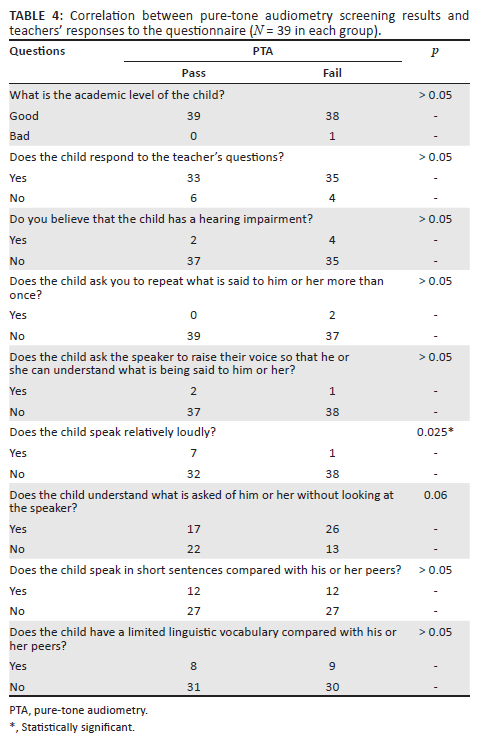 The results were recorded using a standardised recording form for screening data and analysed descriptively and numerically. The percentages of passing or failing the PTA screening and normal or abnormal tympanograms were calculated. Responses from parents' and teachers' questionnaires were compared with PTA screening results to determine any association using Spearman correlation, owing to the non-normal distribution of the data (Kolmogorov-Smirnov test, p ≤ 0.05). Statistical significance was set at p ≤ 0.05.