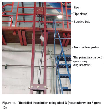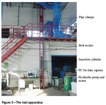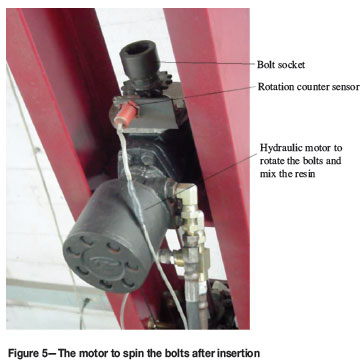The test procedure was simple and the results surprisingly repeatable. Where possible, the resin cartridges used were from the same batch, so that the viscosity was as consistent as was practical. A steel pipe, 1.2 m long with an internal diameter of either 25 mm or 35 mm (matching the bolt hole diameters drilled underground) is clamped in place, and the appropriate resin cartridge is placed in the tube. A bolt is fitted into the socket on the end of the insertion cylinder, and the cylinder is activated upwards, forcing the bolt into the steel pipe through the resin. After being fully inserted, the bolt can be rotated using the motor attached to the cylinder, as shown in Figure 5. This procedure closely mirrors the actual underground bolt installation.