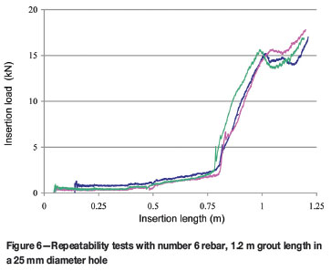 It can be seen from Figure 6 that the results are repeatable and consistent. It is interesting to note that after about 1 m of bolt insertion (0.2 m from full insertion), the force required is over 1.6 tons. The bolt does not buckle, however, because of the short length remaining out of the hole and the resulting high effective buckling strength.