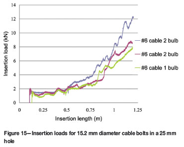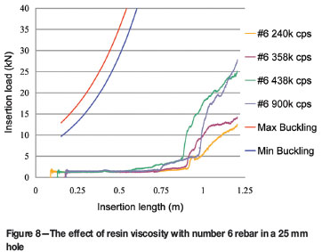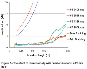 Number 5 and number 6 rebar feature the most common diameters used in US coal mines. Figure 6 gives the insertion loads (back-pressure) results for the number 6 bars in a 25 mm hole with a standard resin.