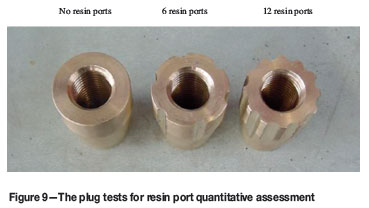 Figure 9 shows the plugs used to establish the effect. The first set of plugs had no resin ports, the second was a standard commercially available design with six resin ports and the third set had twelve resin ports to try to facilitate the resin flow around the shell.