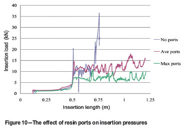 Figure 10 shows the results, and the difference in the insertion pressures is dramatic. Basically, effective resin ports are essential for successful installations using mechanical shells. The plug without resin ports failed each time during installation (this means that the insertion back-pressure exceeded the buckling strength of the bolt and it bent). The shells with the 6 resin ports had insertion loads above 8.8 kN and peaked at 15.7 kN. In contrast, the insertion loads using the 12 resin ports had loads generally below 9 kN with a peak of about 10.8 kN.