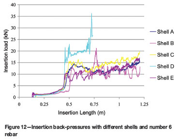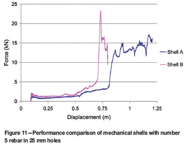 The two commercially available 25mm shells were tested and Figure 11 shows the results. Only one of the shells is suitable for use with resin cartridges, as shell B caused the number 5 rebar to buckle during installation.