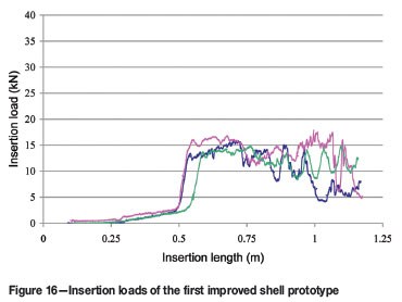 A direct result of this research has been the development of an improved mechanical shell by Frazer and Jones that has the potential (once completely field-tested) to improve performance, reduce insertion loads, and maintain or possibly reduce the cost. Figure 16 shows the results to date, but as the design is 'patent pending', an illustration is not included. It is interesting to see from the graph that during insertion, the viscous drag (hence, load) declines, which should reduce the percentage of failures during installation.