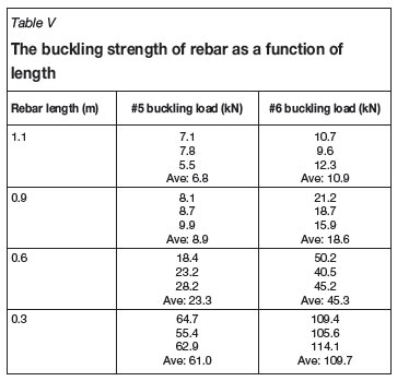 Since the failures are due to the back-pressures causing the rockbolt to buckle before it can be inserted into the hole, the buckling strength of the most commonly used rebar (number 6) was tested. Total installation failures where the rebar buckles during installation are less common than 'spinners', where the shell is damaged during insertion through the resin cartridge due to the pressure. The buckling strength of number 5 and number 6 rebar was measured at different lengths, and the results are given in Table V. The spread of results is significant and is mainly due to the fact that ASTM F432 specifies only a minimum tensile strength and not a range. This data can be used to design bolt systems using resin to reduce the likelihood of a total failure on installation. Such a failure would require an additional bolt to be inserted, wasting both time and money and potentially increasing the safety hazard.