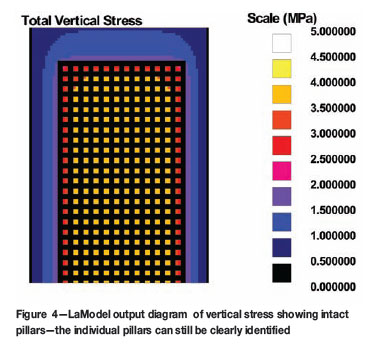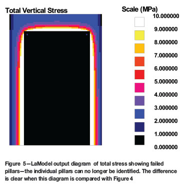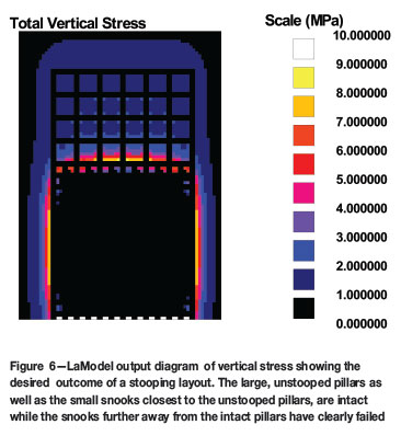 If pillar failure is not indicated at that maximum stress level, and if the ESF remains greater than 1.2, then stooping is possible. If pillar failure is indicated, then alternatives such as leaving lines of pillars in situ before the pillars are expected to fail can be considered. LaModel should be used to determine the positions of those lines of intact pillars and also the number of lines that should be left in situ.