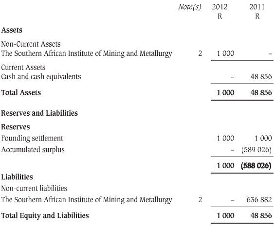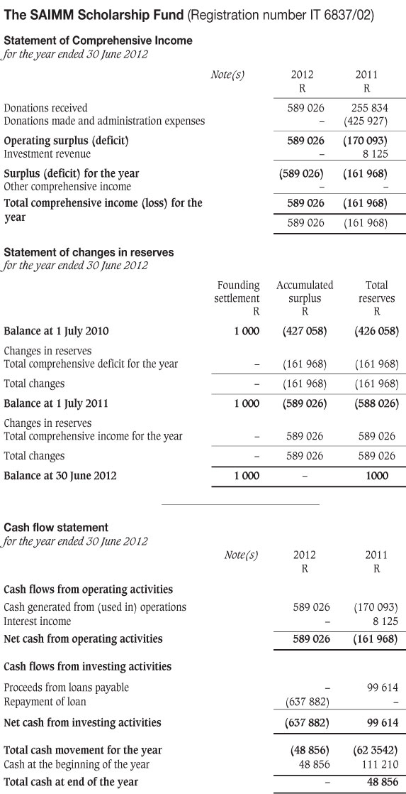 I have audited the annual financial statements of The SAIMM Scholarship Fund which comprise the statement of financial position as at 30 June 2012, the statement of comprehensive income, statement of changes in reserves and statement of cash flows for the year then ended, and a summary of significant accounting policies and other explanatory notes, and the trustees' report, as set out on pages 841 to 844.