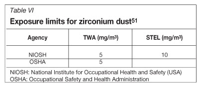 The exposure limits to dusts are usually specified in terms of a time-weighted average concentration for up to a 10-hour workday during a 40-hour workweek (TWA) and a short-term exposure limit (STEL). The values that have been set for zirconium are given in Table VI.
