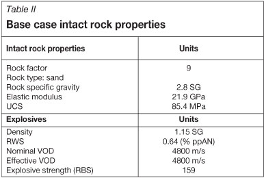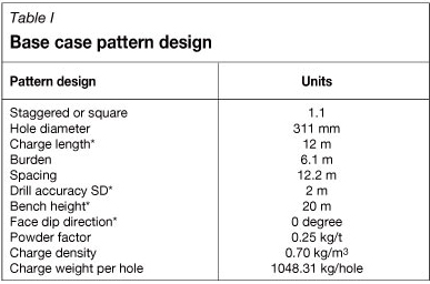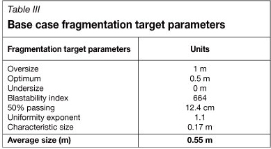 ►Easily illustrates sensitivity to changing parameters The base case is illustrated in Table I. The model allows for a drilling accuracy standard deviation input (SD*) and a face dip direction input in combination with the typical blasting parameters. However, Table II illustrates the abovementioned lack of detailed geomechanics information and timing effects. The base case average fragmentation size is 0.55 m, which was the parameter of comparison between the six scenarios as illustrated in Table III.