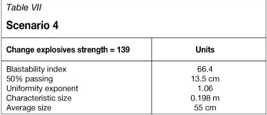 ► Scenario 4-Changing the explosives strength (RBS) from the current 159 to 139 resulted in a 8.9% change in the average fragmentation size (Table VII)