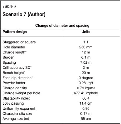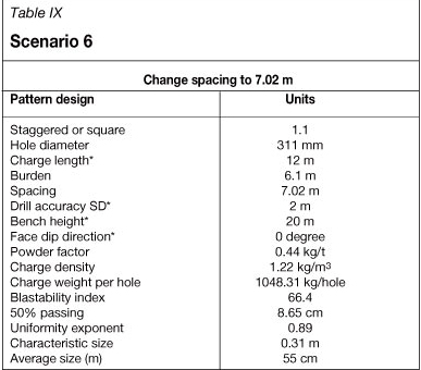 ► Scenario 6-Changing the burden to spacing ratio from the current 2 to 1.15 (rule of thumb), by reducing the spacing from 12.2 m to 7.02 m resulted in a 43% change in the average fragmentation size (Table IX)