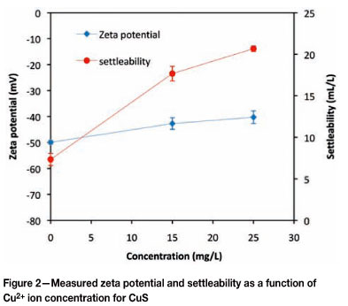 As the concentration of sulphide ions was increased, the respective zeta potential of the copper sulphide particles and the observed particle settleability decreased. The particles suspended in a solution with a S2- ion concentration of 7 mg.l-1 possessed a zeta potential of -57.2 mV. This translated to a decrease in zeta potential of about 7 mV and an associated particle settleability of 0 ml.l-1. A subsequent increase in the concentration of S2- ions led to a further decrease in the zeta potential of the copper sulphide particles and no change in settling characteristics. All the results- presented were reproducible, as shown by the error bars in Figure 2 and 3, which indicate standard error calculated from three experimental re-runs.