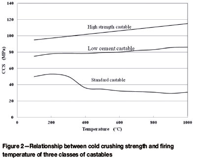The major wear factors in the rotary kilns are slag erosion and abrasion, so in order to compensate for the removal of chrome oxide, mechanical strength and abrasion resistance had to be significantly improved. Mechanical strength of the new high strength material is shown in Figure 2 compared with those of a standard and a low-cement castable.
