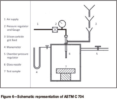 A schematic of the test apparatus layout is shown in Figure 6. A test sample 115 mm x 115 mm x 25 mm is subjected to a stream of compressed air containing silicon carbide particles. After completion of the test the sample volume loss is determined and the abrasion resistance is expressed as a volume loss in cubic centimetres.