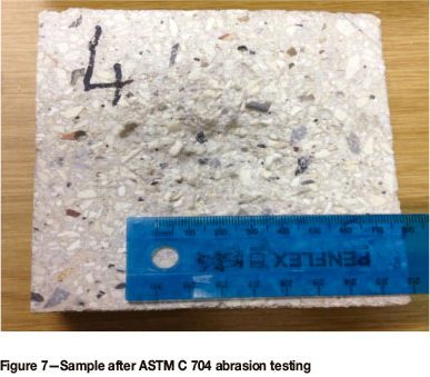 The specified impingement angle of 90° was used, which indicates the resistance of both the matrix and aggregate to impact abrasion. A photograph of a sample after testing is shown in Figure 7. The higher wear of the matrix relative to the aggregate is clearly shown. If the impingement angle is decreased, the degree to which the aggregate protects the matrix against sliding/rubbing abrasion is increasingly shown.