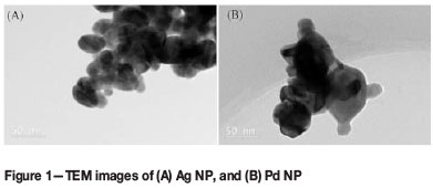 Transmission electron micrographs of the metal powders (Figure 1) detail their polydispersed nature. The size of the NP varied between 50-100 nm for Pd and 20-50 nm for Ag. The Ag NP were spherical or slightly elongated, whereas the Pd NP were multifaceted.
