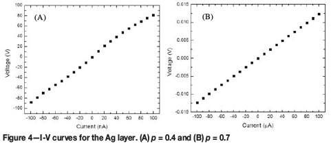 The I-V characteristics of the printed layers show ohmic behaviour for all particle concentrations, except for p = 0.4 of the Ag layers, which displayed nonlinear behaviour (Figure 4). Above pc the nanoparticle clusters aggregate to form a continuous particle network that extends throughout the layer. Therefore the conductivity of the layer is expected to approach that of the bulk metal. Below pc the clusters become isolated, resulting in fewer conducting paths. As a result, the conductivity of the layer deviates from the expected metallic behaviour (Zabet-Khosousi and Dhirani, 2008). Figure 5 shows the sheet resistivity ps plotted as a function of the particle weight fraction. It is observed that the ps increases as the particle concentration is decreased. The ps of the Ag layer increases rapidly from 400 ohm/sqr to 200 ohm/sqraround a critical particle concentration of between 0.4-0.45 (Figure 5A). A smaller change in the ps is observed in the Pd layers in the region of p = 0.4-0.5 (Figure 5B).The value of pc will therefore lie somewhere in the concentration range. The percolation parameters, pc and t, were determined from fitting the ps data with Equations [1] and [2]. The results are shown in Table II. The GEM equation [2] gives a better fit to the Ag ps data compared to the power law [1] which is valid only above pc (Figure 5A,C). The percolation threshold for the Ag layer was determined to be at a weight fraction of approximately 0.45, which was in agreement with both fits. For the Ag layers, the critical exponent t determined from Equation [1] was lower than the value obtained from Equation [2].The Pd ps data fitted with Equation [1] indicated that pc lies at a weight fraction of approximately 0.4 (Figure 5B). The GEM equation was unable to give a good fit to the Pd data. This is because of insufficient data points below pc. The difference in pc for the Pd and Ag layers can be attributed to the manner in which the NP aggregate. Therefore this shows that pc is largely affected by the microstructure of the layer. The values of the critical universal exponent t for the Pd and Ag layers are lower than the reported values (1.65-2.0) for a 3D percolation system (Sahimi, 1994).