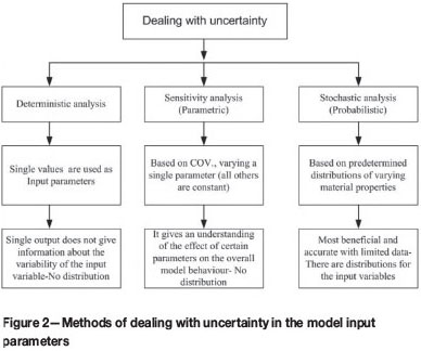 In a deterministic analysis, single values are used as model input parameters. Therefore, a resultant single output value does not give any information on the variability of the input parameter (e.g. no distribution). A parametric study (e.g. sensitivity analysis) can be performed by varying a single parameter according to a certain range (e.g. coefficient of variation) while keeping all other variables constant. This gives an understanding of the effect of certain parameters on the overall model behaviour. However, no distribution is obtained using this method. If data is limited, probabilistic methods or statistical simulations are more powerful. These methods quantify the uncertainty and estimate the likelihood (probability) of occurrence. Therefore, engineers can develop more reliable, robust designs and economical solutions (Hammah, Yacoub, and Curran, 2008).