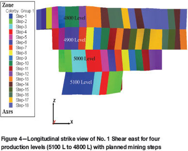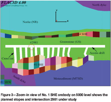 Vale's Garson Mine is located in the greater Sudbury area of Ontario, Canada. The mine has been in operation for more than 100 years and has produced 57.2 Mt containing an average grade of 1.33% copper and 1.62% nickel (Vale, 2009). The current production is 2400 t/d. Both transverse and longitudinal stope mining methods are employed with delayed backfill in an upward direction. The typical planned stope dimensions are 30x15x12 m (height x length x width: 100 x 50 x 40 ft.). The stopes are extracted in two or three blasts and then tight filled with a mixture of pastefill and waste rock. In the area of the current investigation, two orebodies are found - namely, No. 1 Shear (east and west) and No. 4 Shear (east and west), which have a strike length of approximately 610 m (2000 feet) each, and a dip of 70° to the south. These orebodies, however, vary in size and shape. An olivine diabase dyke crosses the two orebodies near mid-strike on the 5100 level. The dyke is steeply dipping to the south-west and continues with depth. The footwall typically consists of norite (NR) and greenstone (GS) and the hangingwall consists of metasediments (MTSD) as shown in Figure 3. The stability analysis is conducted, using Itasca's FLAC3D (ITASCA, 2009) for the No. 1 Shear East orebody, whereby a planned sequence of 108 stopes over four production levels (5100, 5000, 4900, and 4800) is simulated in the form of 18 mine-and-fill numerical model steps (i.e. each step represents six stopes); see longitudinal strike view in Figure 4. While doing so, the strength-to-stress ratio is monitored on level 5000 at the intersection of 3150 haulage drift with the crosscut at the 2981 location.