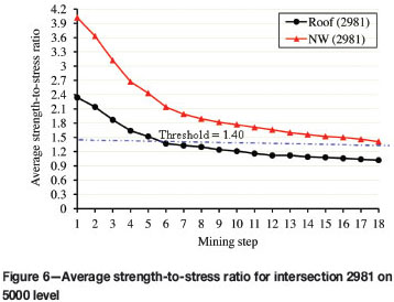 In order to assess the stability of the intersection, a performance criterion must first be selected. This may be one of a large number of conditions such as maximum permissible floor heave ratio (e.g. the ratio of the floor heave to the span of the drift) or roof sag ratio (e.g. the ratio of the roof/back sag to the span of the drift), or allowable stress concentration factor (normally associated with linear elastic analyses), or a yielding condition such as Mohr-Coulomb or Hoek-Brown (Abdellah et al., 2012; Zhang and Mitri, 2008). The choice of a performance criterion is dependent on the application and field observations. In the current study, very little deformation is observed at the intersection in response to mining activities, as shown by the extensometer installed at the intersection, thus making it difficult to set a threshold. Details of the field monitoring programme and instrumentation results are beyond the scope of this paper. Therefore, a yield-based criterion has been selected in which Mohr-Coulomb is used as the failure condition. Adopting a safety factor of 1.4, it was decided that the stability performance of the intersection is considered satisfactory when the Mohr-Coulomb strength-to-stress ratio is equal to or greater than 1.4. Strength-to-stress ratio is a built-in function in FLAC3D. It should be noted that the numerical analysis carried out is elastic-perfectly plastic. Thus, as a yielding-based function is adopted (e.g. strength-to-stress ratio), yielding theoretically occurs at a ratio < 1.