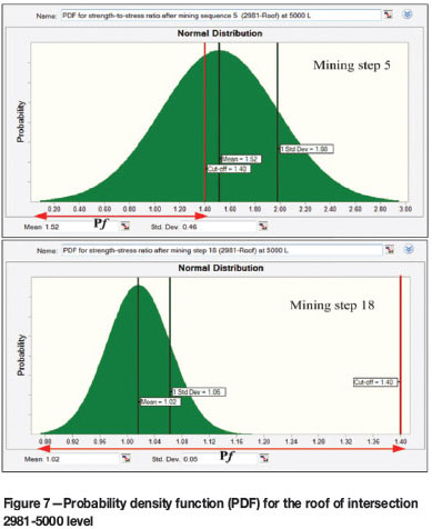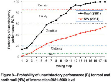 The probability density function (PDF) is shown in Figure 7. It can be seen that the increase in the area under the curve (e.g. on the left of the threshold line) represents unsatisfactory performance (instability) as mining advances. This indicates increasing probability of instability. The probability of unsatisfactory performance is shown in Figure 8. It can be seen from Figure 8 that the roof of intersection 2981 on level 5000 may require secondary support after mining step 11 since the probability of instability is certain (Pf > 85%). However, the north wall (NW) looks stable and its probability of instability lies between rare and possible (highest probability of instability Pf < 60%).