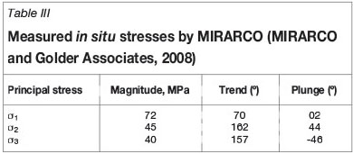 Table III shows the values of o2 and σ3 are close in magnitude, thus limiting the accuracy of the orientations. Therefore, it will be assumed that the minimum principal stress is oriented vertically and equal in magnitude to the weight of the overburden. The resulting stress values used in the calibration model are as follows (MIRARCO and Golder Associates, 2008; Perman, 2011):