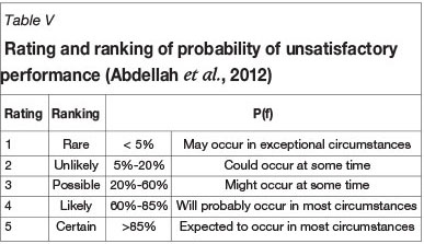 According to the above definition of risk, the probabilistic analysis is carried out and discussed in detail in the next section. The estimated probability of unsatisfactory performance is then rated and categorized according to Table V (Abdellah et al., 2012).
