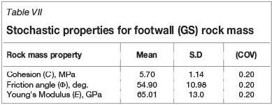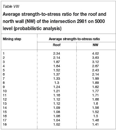 Based on the parametric study (sensitivity analyses) that has been conducted, the most influential model input parameters are Young's modulus (E), cohesion (C), angle of internal friction (φ), and horizontal-to-vertical stress ratio (K). K is not considered in our probabilistic analysis as the in situ stresses were measured in the mine. In this study, only Young's Modulus (E), cohesion (C), and friction angle (φ) are considered, with the Mohr-Coulomb strength-to-stress ratio as shown in Table VII. The modified point-estimate method (Zhou and Nowak, 1988) of (2n2+1) is adopted in this analysis (e.g. 19 runs for the three input variables). The coefficient of variation (COV) is taken as ± 20%.