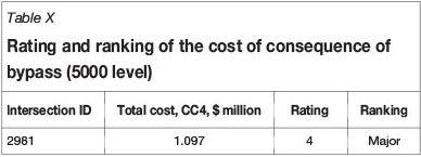 Table IX shows the total cost of developing the new bypass is about $1.097 million. The rating and ranking for the cost of consequence to the intersection under study are given in Table X, according to the assumed ratings and rankings of the cost of consequence given in Table VI.
