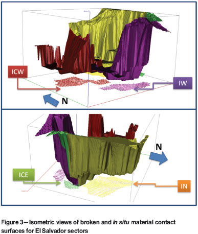 Figure 3 shows isometric views of the broken and in situ material contact surfaces for the El Salvador sectors. For Inca Central East (ICE), Inca North (IN), and Inca West (IW), the dilution sources are located mainly to the side of the sector, while for Inca Central West (ICW), the source is located above the sector. This has an important influence on the dilution entry profile for the different sectors, except for the IW sector, where a hang-up of the cave back that occurred during the first stages of extraction caused rapid dilution entry after an air blast (De Nicola and Fishwick, 2000).