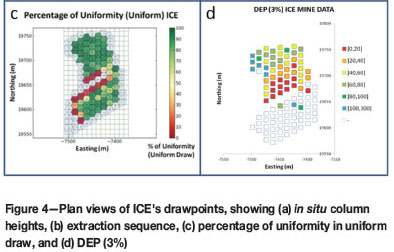 For Inca Central East, the extraction sequence proceeds from the lowest in situ column (under 50 m) to the higher ones (over 400 m). This means that the extraction sequence starts from the dilution source in the north. Following the sequence, the dilution entry point decreases until a broken rock pillar created by the inactive drawpoints (orepasses) acts as a dilution barrier. In this case, dilution travels from the source at the northern zone to the central zone (Figure 4d).