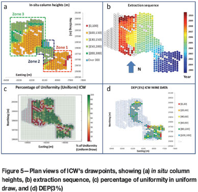 For the Inca Central West (ICW), the extraction sequence starts with 130 m in situ column heights (zone 1), passing through column heights of over 200 m (zone 2) and then back to 130 m in situ column heights (zone 3). In this case, the dilution source is located above the sector. The DEP(3%) goes from 40%to 100% for zone 1, then increases to over 100% for zone 2, and goes from 80% to over 100% in zone 3. Data shows that dilution enters due to the vertical displacement of the broken material from the sector previously extracted and located above ICW.