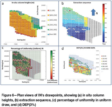 The dilution entry analysis consisted of evaluating the dilution entry behaviour at a drawpoint scale and considering the diverse initial conditions of the different sectors, that is, in situ column heights, extraction sequence, and uniformity of extraction. This empirical analysis was carried out to develop a hypothesis for the mechanisms by which dilution entered the drawpoints. The uniformity index introduced by Susaeta (2004) was used to calculate the uniformity with which extraction was performed (IU).