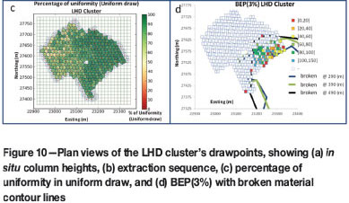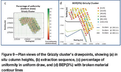 At the Grizzly and LHD clusters, different conditions prevailed regarding the original position of the broken material before extraction began. On the western side of the Grizzly cluster, there are two exhausted panels that form a wall of broken material; thus, the dilution source for this panel was located mainly next to the cluster and not above it (Figure 9b). On the other hand, the panel located at the southern side of the LHD cluster had extracted less than 10 m of the in situ columns when extraction began; thus, the dilution source was the broken material left from the extraction of the previous panel. Well-controlled extraction in terms of the uniformity at the LHD dilution cluster, together with the fact that dilution was located above the panel, led to high dilution (broken material) entry points for the cluster's drawpoints (Figure 10d). The broken material entry analysis for the Grizzly cluster shows that, despite the broken material source being located on the western side of the panel, the whole cluster shows evidence of early entry of this kind of dilution (Figure 9d). This could be due to the extraction of the old panel, which caused subsidence and flow of the broken ore to the new panel.
