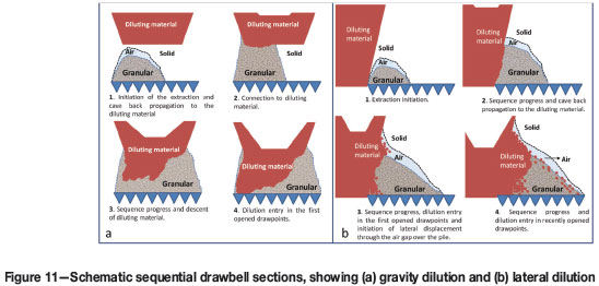 In terms of the stage of mining, dilution could occur during caving and after the cave has broken through to the surface. During cave propagation, if the extraction pile height is lower than the cave back height for a given area, an air gap could develop, allowing dilution to enter the draw column. Thus, if the draw rate (Vex) is larger than the cave propagation, a gap will form if: