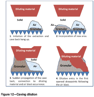 If the hydraulic radius of the initial opened area is insufficient for continuous propagationof the cave, a hang-up of the cave back will occur. If extraction continues in the opened area without incorporating new area, a large air gap will be generated. Once new area is incorporated, the cave back will suffer a sudden propagation and dilution located above the panel will enter the first opened drawpoints following an air blast. This is the case observed at the Inca West (IW) sector (Figure 12). In this case, the dilution entry and the recovery are low.