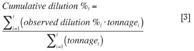 where observed dilution%i and tonnage, are the dilution percentages observed at the drawpoint and the tonnage drawn during period i, respectively. The cumulative curves allow for regularizing the curve behaviour and analyses when the overall dilution content exceeds a certain threshold. Once the use of the cumulative curves is selected, the criterion for declaring dilution entry at a drawpoint is reduced to selecting the threshold to be exceeded by cumulative dilution content. Figure 2 illustrates an example of the dilution content for the drawpoint A69W51 at El Salvador Mine. It also indicates the change in the tonnage at 3% [DEP(3%)] and 5% [DEP(5%)] of the overall (cumulative) dilution content. In this case, it is shown that a 3% cumulative is equivalent to 40% observed dilution at a drawpoint.