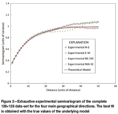 In practice, of course, an exhaustive sampling is not possible and, in most geoscience applications, the total sample volume is significantly less than 1% of the total volume from which the measurements are taken. For example, a quartz-vein hosted gold deposit extending over an area of 900 m x 300 m and a vertical extent of 150 m would typically be sampled for reserve estimates on a drilling grid of 30 m (along strike) x 15 m (across strike). Assuming that each drill-hole is 150 m in length and that the diameter of the core is 10 cm, the total sample volume represents 0.002% of the total orebody volume. The proportion of samples does, of course, have to be tempered by the range of spatial correlation and the nugget effect to account just for the independent amount of information in the sample, thus reducing even further the sample representativity. In the synthetic simulated example reported here for demonstration purposes, we have considered primarily samples of size 50, which are: (a) 0.3% of the total possible number of samples that could be taken, and (b) on average, 18 units away from the nearest neighbour, or 60% of the effective range of 30 units. The analysis included samples up to size 200 in some cases.