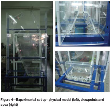 To understand the effects of flow on the design of large SLS applications, controlled experiments were conducted. The objective of the laboratory experiments was to study the ore flow within a sublevel stope under inclined geometries. For the purpose of the experiments, a physical model having a typical geometry of a large stope with a footwall inclination of α = 70° and hangingwall inclination of b = 90° was built in the laboratory (Figure 4). During the design stage of the experiments, all the laws of kinematic similitude for granular materials - that is geometrical similitude, extraction rate and friction angle - were taken into consideration (Pineda, 2012).