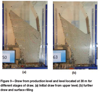 These two experiments were undertaken to determine whether the inclusion of another level is necessary to extract the ore above the footwall in SLS, under the assumption that flow of the wedge does not occur. The new level was located 60 mm above the production level (30 m when scaled to a real sublevel stope). Draw from this level started after the initial draw of material from the production level. As indicated in Figure 9, the flow zone of the drawpoint located at the footwall was connected to that developed due to the flow of Level 1 (Figure 9a). Drawing from this new level improved the early recovery of ore located at the base of the footwall, as shown in Figure 9b.