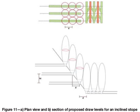 4. Finally, if the stope is inclined (α <90°), more than one level may be considered, vertically spaced at a height of hi metres. As shown in Figure 11, the location of the levels would depend on the width of the IMZ and the inclination of the stope. In this case, the horizontal spacing should be such that the IMZs, with diameter of d metres, overlap. In Figure 11, an example is provided where there is a main draw level (Figure 11a) and other three draw levels are located at the footwall of the stope (Figure 11b) to achieve maximum recovery of the stope. In this case the vertical distance ( hi) between drawpoints is: