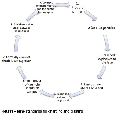The mine standards prescribe the following when charging up and blasting (de Beer and Ross, 2012):