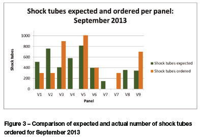 In September 2013, the expected explosives utilization was exceeded by 51.3%. This was calculated by direct comparison of the explosives ordered and the production throughput (Table I). The general trend for the month was that more explosives were ordered than expected. Eleven cases of explosives and 300 shock tubes were ordered for panel V7, yet there was no production from that panel. The mine records this as explosives unaccounted for (wasted). Upon investigation, it was found that the 16th level is seismically active with bad ground conditions. This particular panel had been badly affected by a seismic event and had been closed, and the miner was assisting in panels V2 and V7, since all three panels are on the same working level. Panel V2 ordered only 58% of expected explosives, and V7 ordered no explosives. Possibly, the first miner was placing explosives orders for the two panels he was assisting in. An explosives order may only be placed by a miner for a workplace officially assigned to him (de Sousa, 2013). Therefore, 11 cases and 300 shock tubes can be accounted for. The remainder of the panels ordered more explosives than expected, and the possible reasons for this are discussed in detail later.