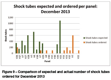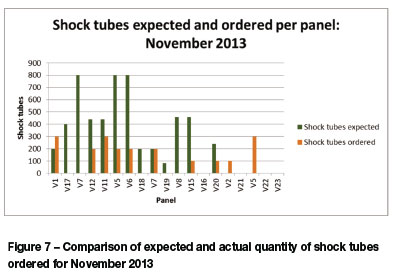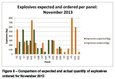 The mine has a record-keeping system in place in which all miners order their explosives and accessories for specific workplaces. As can be seen from the results obtained, some workplaces have placed orders for explosives while there is no production to account for the usage. However, it is common for a miner in charge of multiple panels that are relatively close to each other to order explosives for panel A but use them to blast panel B. Comparisons of the expected and actual quantity of explosives used per panel exaggerate the extent of the problem, since the trade of explosives between panels is not taken into account.