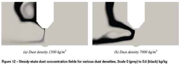 In general a dust stream entering a DC furnace as part of the raw material feed will be polydisperse, that is, it will consist of a distribution of particle types and sizes. It is therefore of some value to examine the effect of changing the dust properties, which affect the settling velocity Us, on the dust behaviour in the model. Dust density may be taken as a crude proxy for the composition of the particles - low densities of the order of 1500 kg/m3 are typical for carbonaceous reductants, while higher densities of 7000 kg/m3 or more are common for metallic components in the furnace feed. Different densities were tested in the model while keeping all other parameters constant as per the base case. The standard 100 ms arc time-averaging calculation with 25 ms of averaging was used, together with an additional 100 ms run time for the dust transport model.