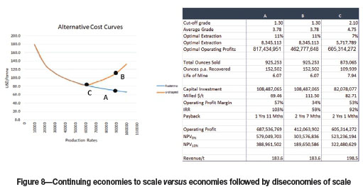 It can be demonstrated that the prevailing hypothesis in the mining industry, best articulated by Rudenno's work, may have been a significant contributor to the sustained erosion of margins and profitability. Using Rudenno's information, a financial model was constructed to compare the effects and implications of the two cost hypotheses described. By way of demonstration, Figure 8 illustrates two curves; the first assumes constant economies of scale in line with Rudenno's work, and the second, with an arbitrarily selected level/point of cost inflexion, implies diseconomies of scale in line with Minnitt et al.