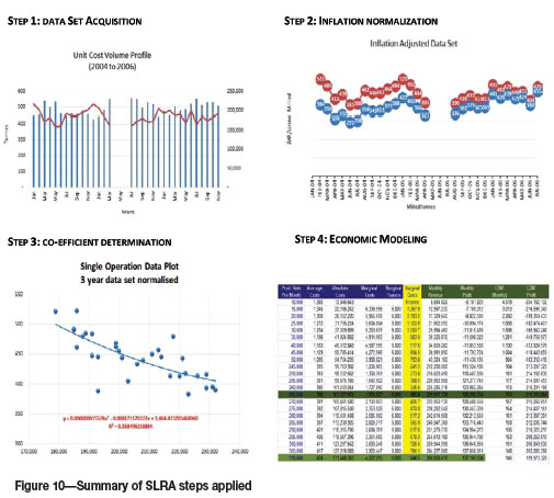 Figure 10 describes four key steps in the derivation of the cost curve based on an empirical data-set. The table formulated in Step 4 is similar to Minnitt's construct and is graphically illustrated in Figure 9. The average cost curve with its marginal cost curve are plotted reflecting the classical economic curves described by scholars after Minnitt (2007) and Kohler (1992). Steps 1 and 2 illustrate the normalization of unit cost data collected for the period 2004 to 2006, while Step 3 adopts a polynomial expression, namely x2 + x + c, based on the theoretical understanding after Minnitt et al. The derivation of this curve is relatively simple given the principles of SLRA and desktop computing. The standard Excel regression toolkit was used to derive the regression equation. The polynomial functional form selected is based on economic theory after Studemund (1992).