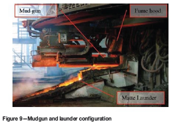 The alumina-chrome refractory-cast matte launder, mudgun unit, and fume extraction hood can be seen in Figure 9. The matte launder consists of two pieces, the spout and the launder itself from where matte is transferred to a 12 t refractory-lined ladle.
